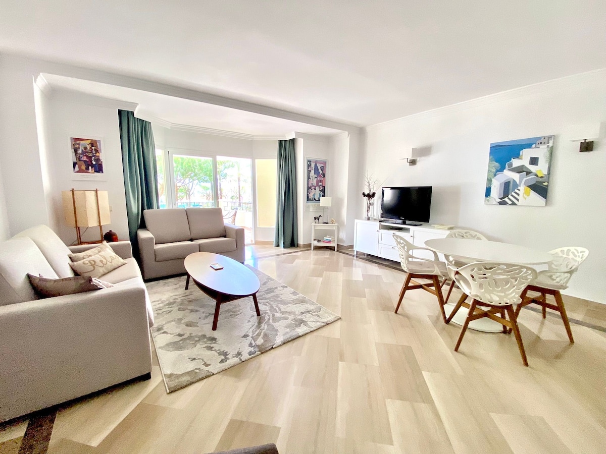 Welcome to Hacienda Playa Elviria Seaviews – EaW Homes, Andalusian essence and the sea just steps awayThis cozy and elegant apartment for 4 people is the perfect place to enjoy a relaxing vacation with family or friends, combining comfort, spacious outdoor spaces and an absolutely privileged location. With two bedrooms and two bathrooms, the house offers a bright and quiet atmosphere, ideal for disconnecting and letting yourself be carried away by the rhythm of the Mediterranean.The spaceLocated on the first floor within the prestigious Hacienda Playa development, the apartment has a spacious and bright living room, designed to share moments of rest and relaxation. From here you can access a large terrace overlooking the sea, one of the great attractions of the house. The terrace is carefully equipped with a fantastic chill-out area, a dining table for outdoor lunches and dinners, and sun loungers where you can sunbathe privately, listening to the sea breeze and enjoying the surroundings.The kitchen is fully stocked, offering everything you need to cook comfortably during your stay. The master bedroom has a 150 cm double bed and an en-suite bathroom with a double sink, providing extra comfort and privacy. The second bedroom has two 90 cm single beds and its own full bathroom, ideal for children or companions.The apartment has central air conditioning, fiber optic Wi-Fi and a private garage space, guaranteeing comfort and tranquility throughout the stay. The development offers large, perfectly maintained green areas, two large community pools and a paddle tennis court, creating a pleasant and safe environment for adults and children.Registration DetailsAndalucia - Regional registration numberVFT/MA/43966Spain - National registration numberESFCTU0000290280002781560000000000000000VUT/MA/439665